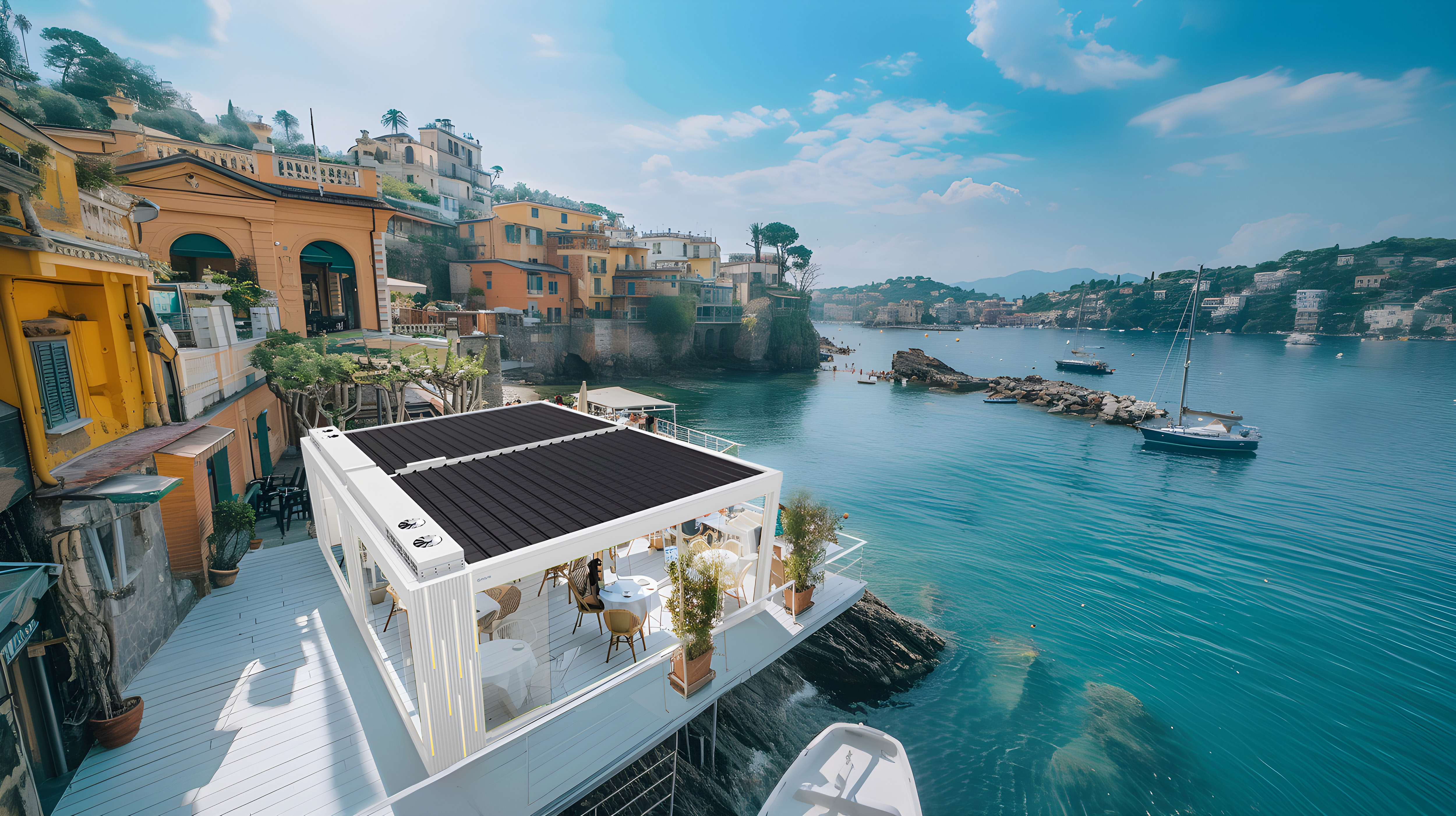 Show MoreThe Ombra Smart Pergola is a groundbreaking addition to modern living, merging futuristic design with nature. It offers expansive views through a seamless blend of metal and glass. Ombra features a smart lighting system and advanced technology, allowing for personalized climate control and ambient lighting. This innovation lets you enjoy nature in any season, providing exquisite shade and comfort. Ombra embodies the perfect harmony of innovation and nature.